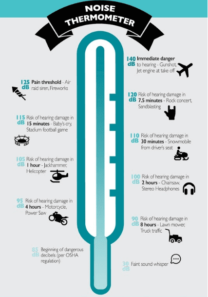 The measurement of sound happens in units called decibels. At or below 70 A-weighted decibels (dBA), the sound level is unlikely to cause any hearing loss even after prolonged exposure to the noise. However, if you face prolonged exposure to sounds at or above 85 dBA, it can cause hearing loss. The louder the noise, the faster you get affected by Noise-induced Hearing Loss.